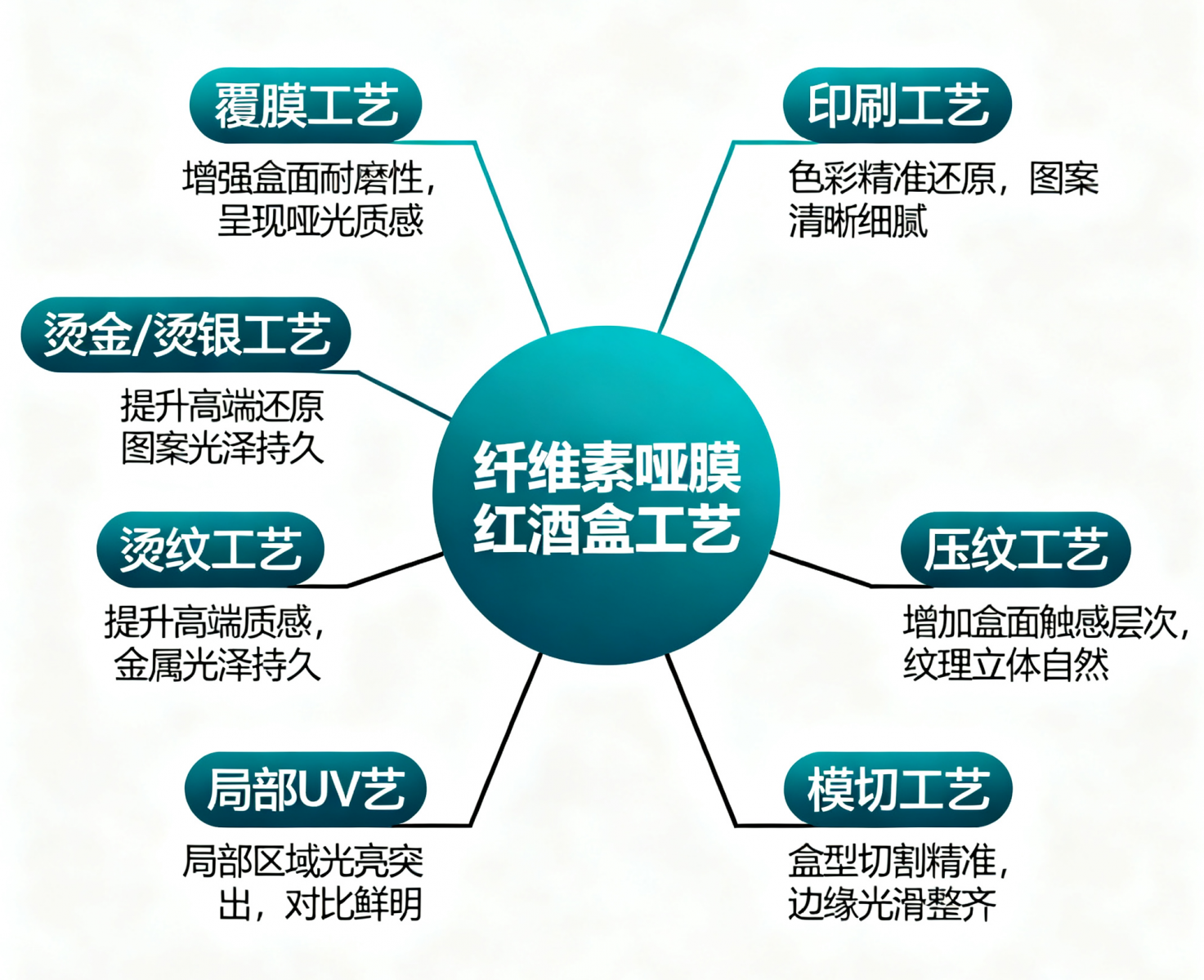 局部 UV 工藝:在纖維素啞膜表面的特定區域進行 UV 上光處理,使該區域形成光亮的效果,與啞膜的啞光部分形成鮮明對比,突出紅酒盒上的重點信息或圖案,如紅酒的品牌標識、葡萄品種等。 模