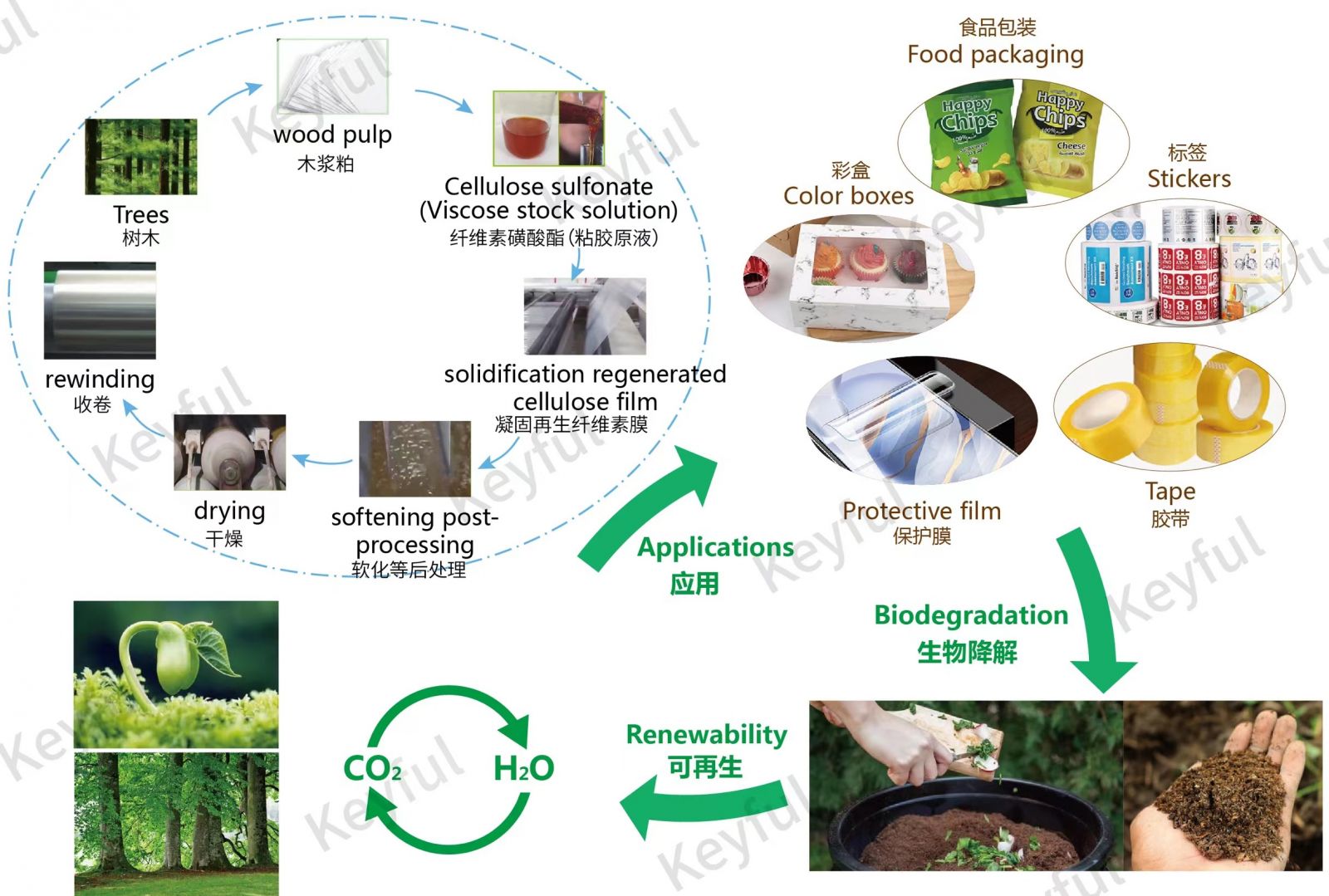 纖維素膜在家庭堆肥或者工業堆肥的條件下,在十二個月內最終會降解成為水和二氧化碳,對大自然完全無害,
